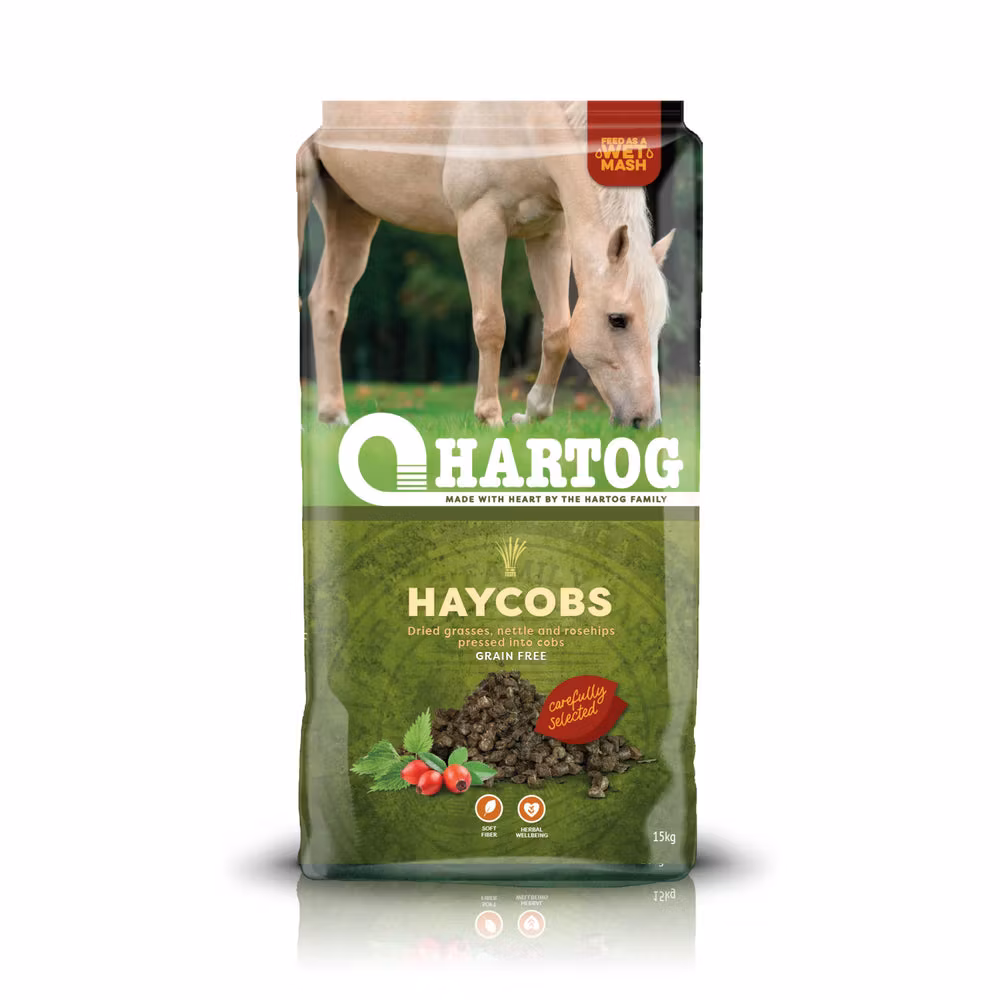 Hartog Haycobs består av hö, torkat gräs, kornhalm, linfrö, nypon och nässlor. De innehåller inget spannmål eller melass. De har dessutom ett lågt socker- och stärkelseinnehåll och kan därför vara ett utmärkt alternativ till kornrika mash-typer om du försöker undvika för mycket socker och stärkelse till din häst.